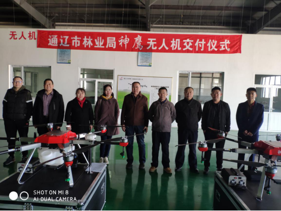 2019年3月11日,“神鷹”植保無人機交付儀式在通遼市神鷹飛機制造有限公司舉行,通遼市林業(yè)局森林病蟲害防治檢疫站敖特根、李仁貴等領(lǐng)導,以及通遼市神鷹通用航空有限公司總經(jīng)理司治莊、副總經(jīng)理齊洪峰、通遼市神鷹飛機制造有限公司副總經(jīng)理魏建東參加了交付儀式。